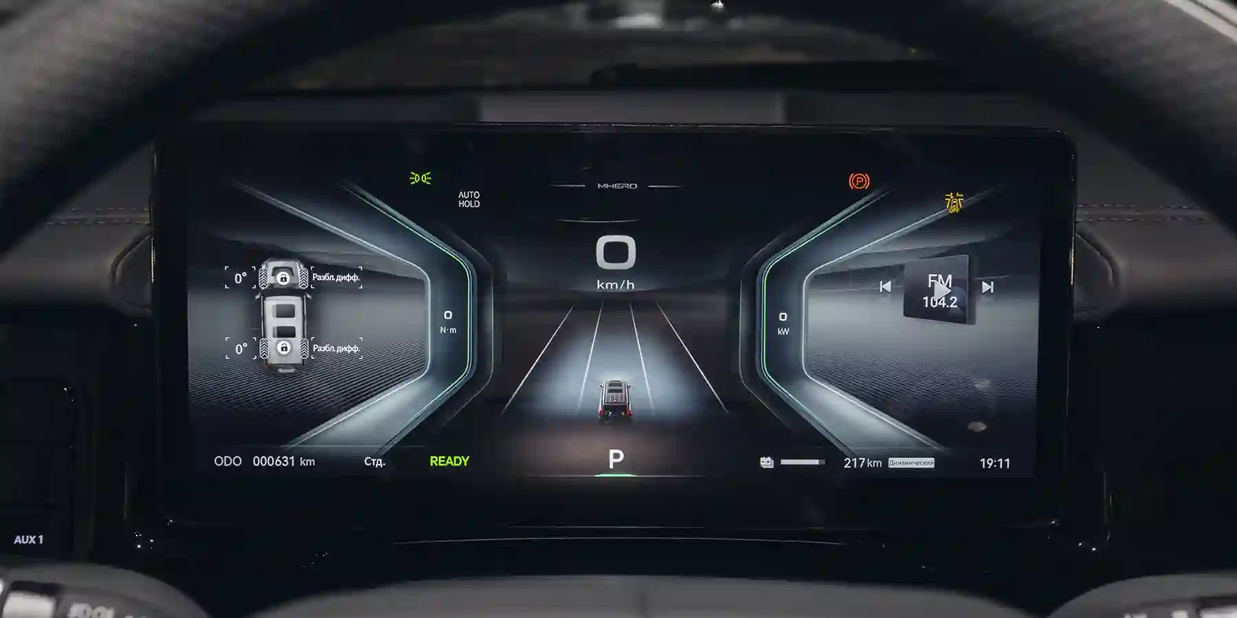 M‑HERO показал себя просто по-геройски. Во-первых, он был ангельски тих: электромоторы не давали о себе знать ни шумом, ни вибрацией, а ДВС ни разу не вступил в дело. Но главное, мне очень понравилось, как «Воин» едет: подвеска скрадывает все дорожные неприятности, позволяя почти не замечать «лежачих полицейских», и при этом машина прекрасно держит траекторию в поворотах. На высоких скоростях она волшебным (точнее, пневматическим) образом припадает к земле на 45 мм, в результате высокий рамный вездеход весом в три с лишним тонны проходит виражи лучше, точнее и с меньшими кренами, чем большинство городских китайских «паркетников». Особенное удовольствие доставила езда по проселкам. Никакие ямы, кочки, рытвины, гребенка «М-Герою» не страшны, он проходит их на ура — главное, чтобы ваш пассажир не пугался и покрепче держался за массивный поручень на передней стойке. Такой замечательный характер обусловлен конструкцией подвески. Независимая, на параллельных треугольных рычагах не только спереди, но и сзади, где у прочих рамных вседорожников находится неразрезной мост, она обеспечивает недостижимую для конкурентов управляемость. И, разумеется, замечательную проходимость. Кроме привода на все колеса, понижающего ряда передач, могучего крутящего момента в 1050 Нм, большого хода подвески и блокировок межколесных дифференциалов на вооружении M‑HERO — пневмосистема, с помощью которой можно увеличивать клиренс со стандартных 221 до 326 мм. Глубина брода при этом достигает 900 мм, а углы въезда и съезда увеличиваются с 31 до 36,8° и 37,5° соответственно. Мало того, задние колеса машины сделаны управляемыми. На скоростях до 20 км/ч «М-Герой» поворачивает их на 10,6 градуса в сторону, противоположную передним, облегчая водителю развороты. Но можно принудительно поворачивать их вместе с передними — такая «крабья походка» еще больше увеличивает маневренность машины и ее возможности вне асфальта.